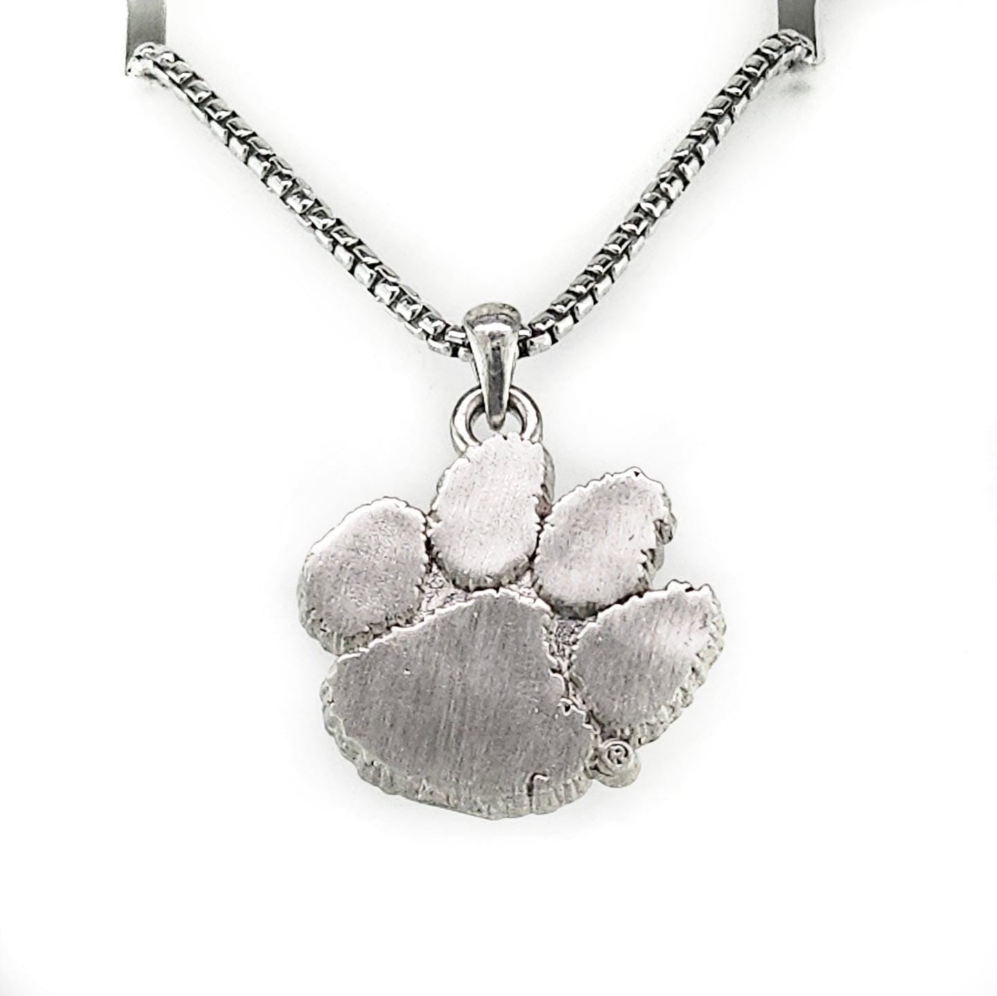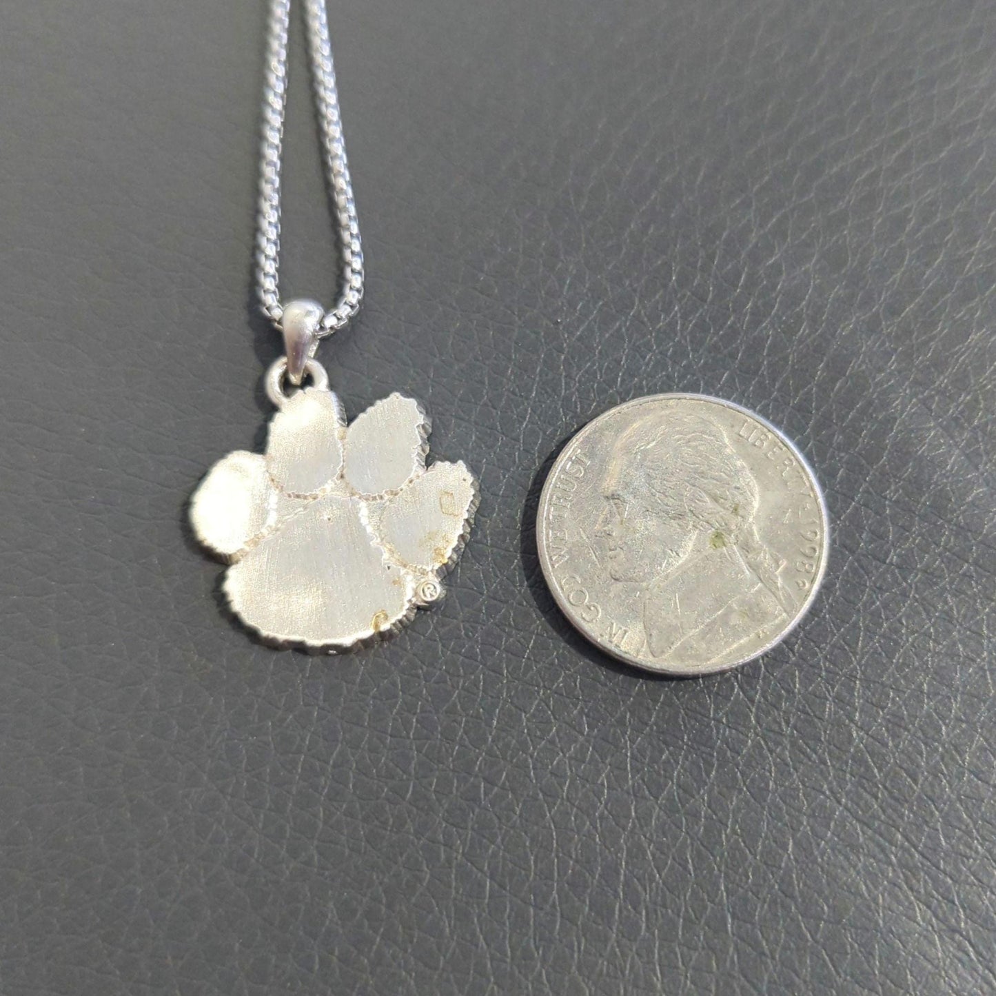 Sterling silver Clemson paw pendant on a silver rolled box chain with lobster clasp.