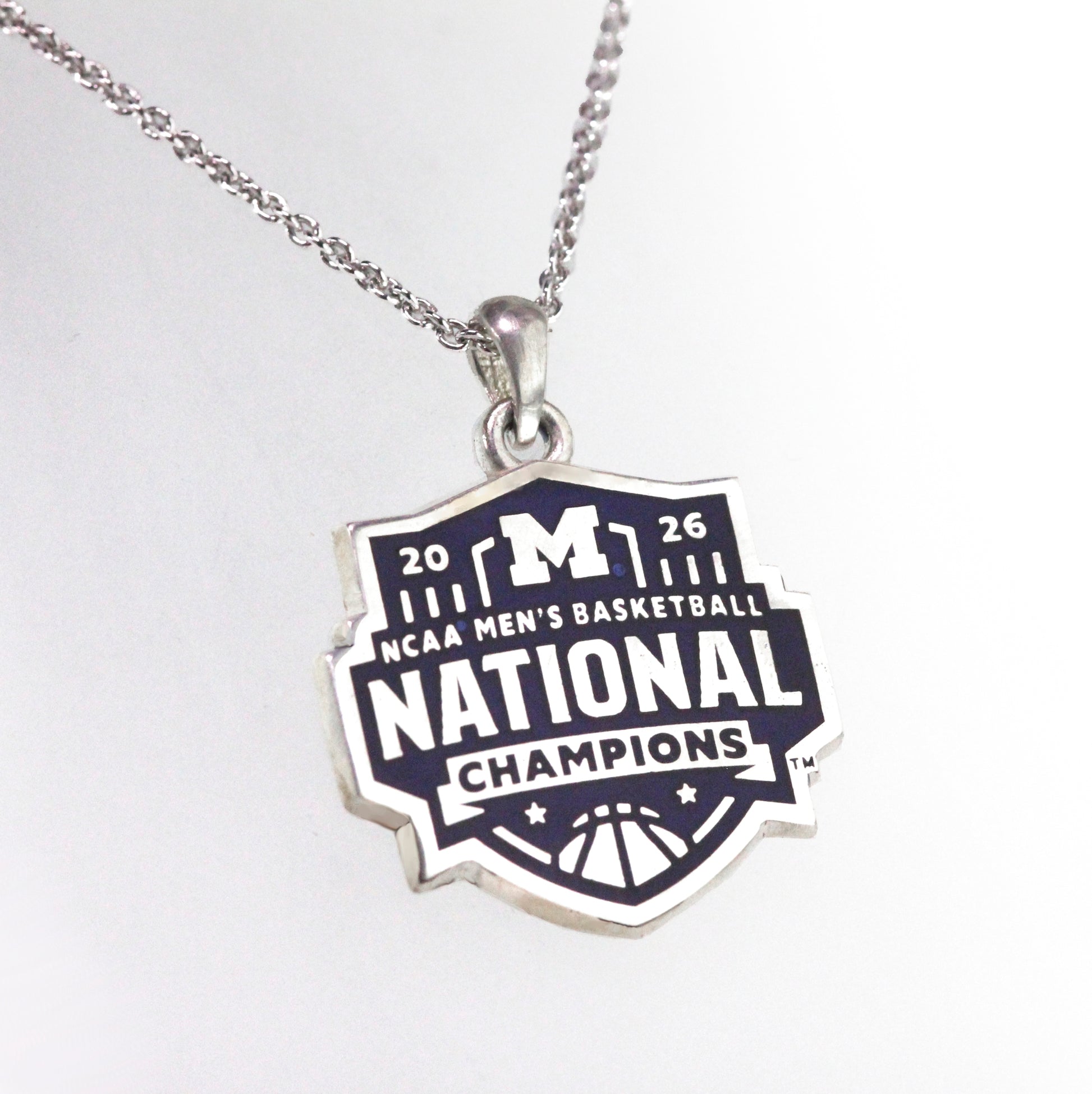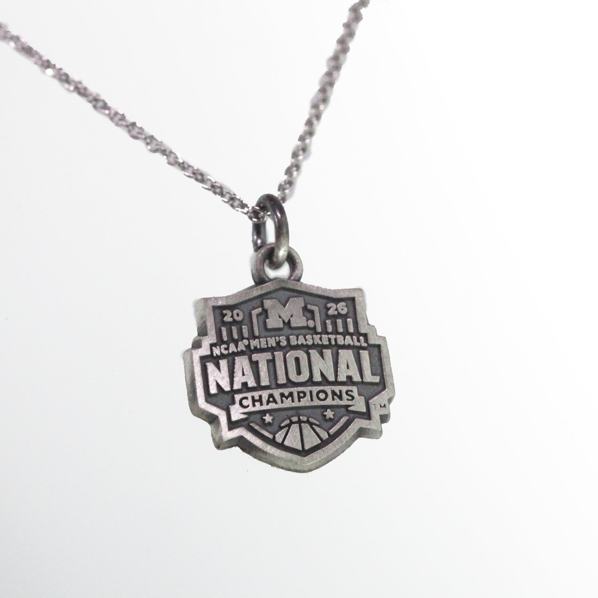 The 2026 Men's basketball National Champions are the Michigan Wolverines! This sterling silver pendant with an antique finish is a great commemorative piece to add to your collection. This is also available with Michigan blue resin enamel. The chain is sterling silver and rhodium plated to keep it shiny.