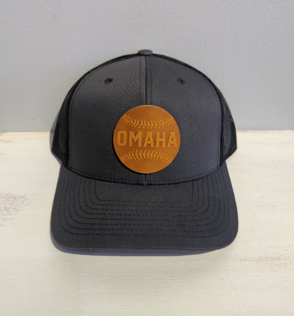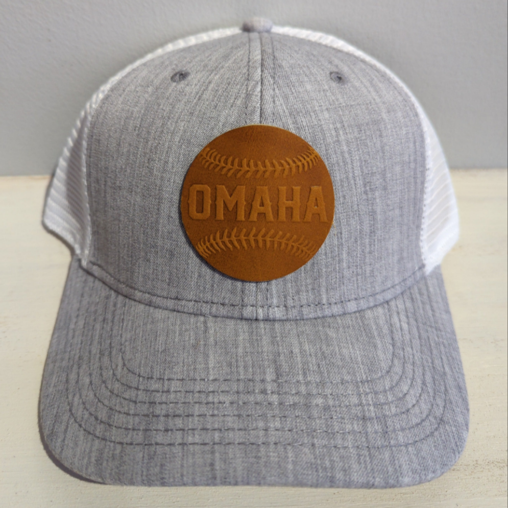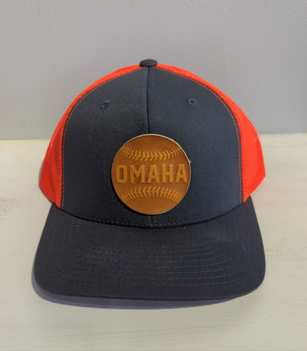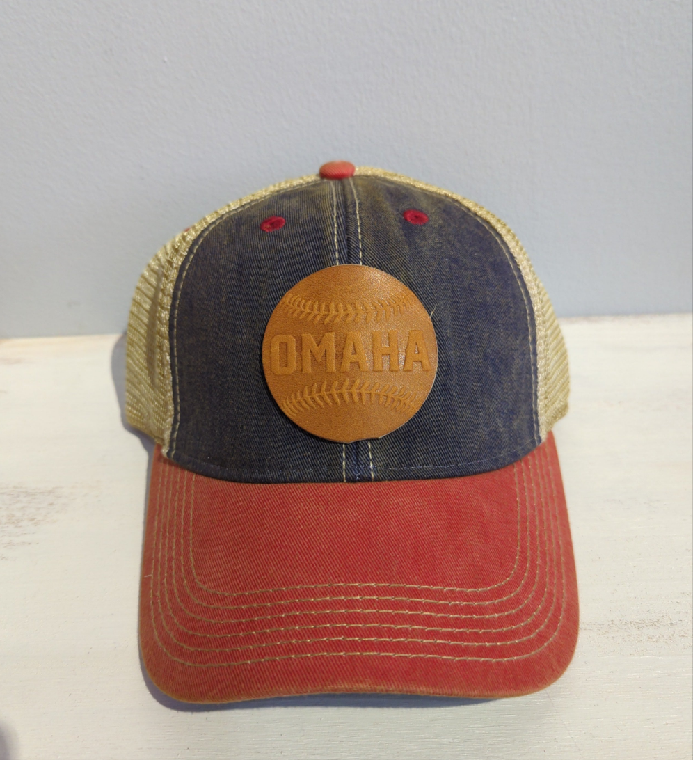These popular Trucker hats come in many color combinations with an Omaha baseball patch made from baseball glove leather. These hats have an adjustable snap back. Made in Omaha!