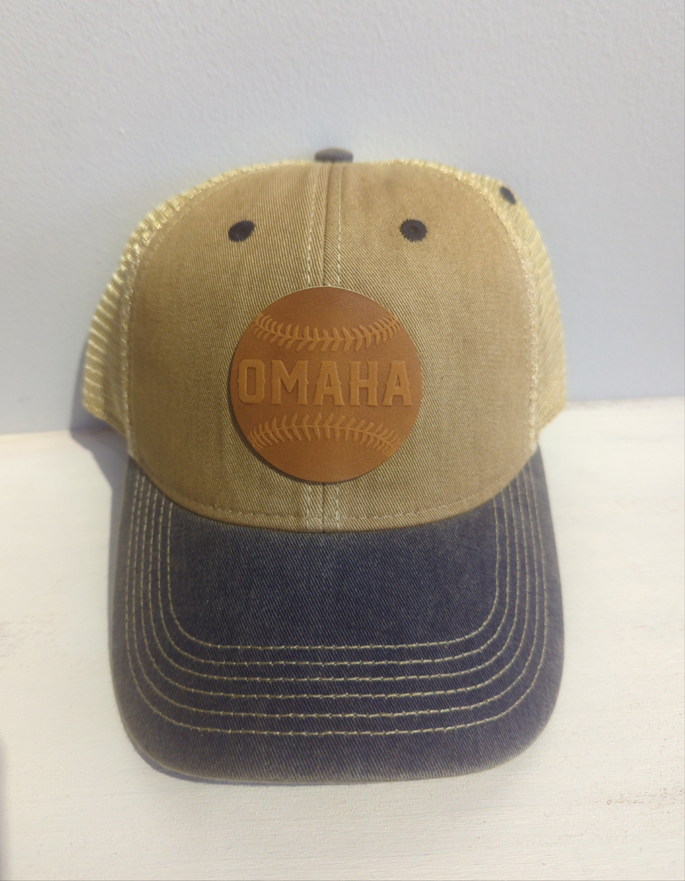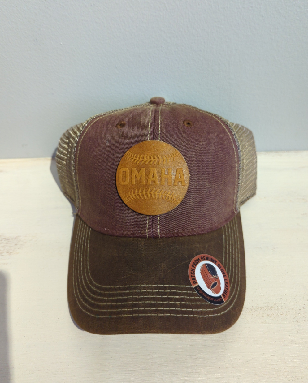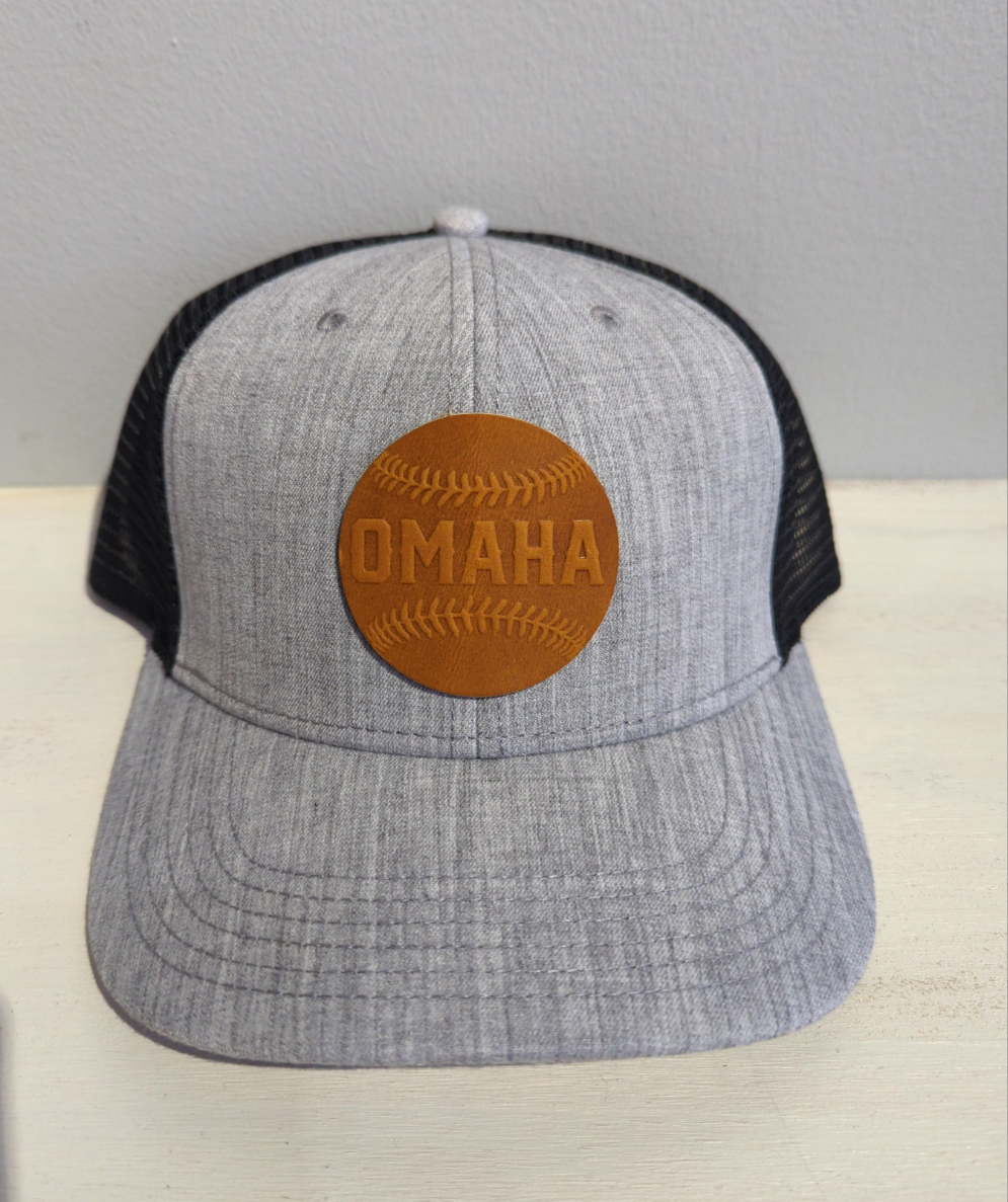These popular Trucker hats come in many color combinations with an Omaha baseball patch made from baseball glove leather. These hats have an adjustable snap back. Made in Omaha!