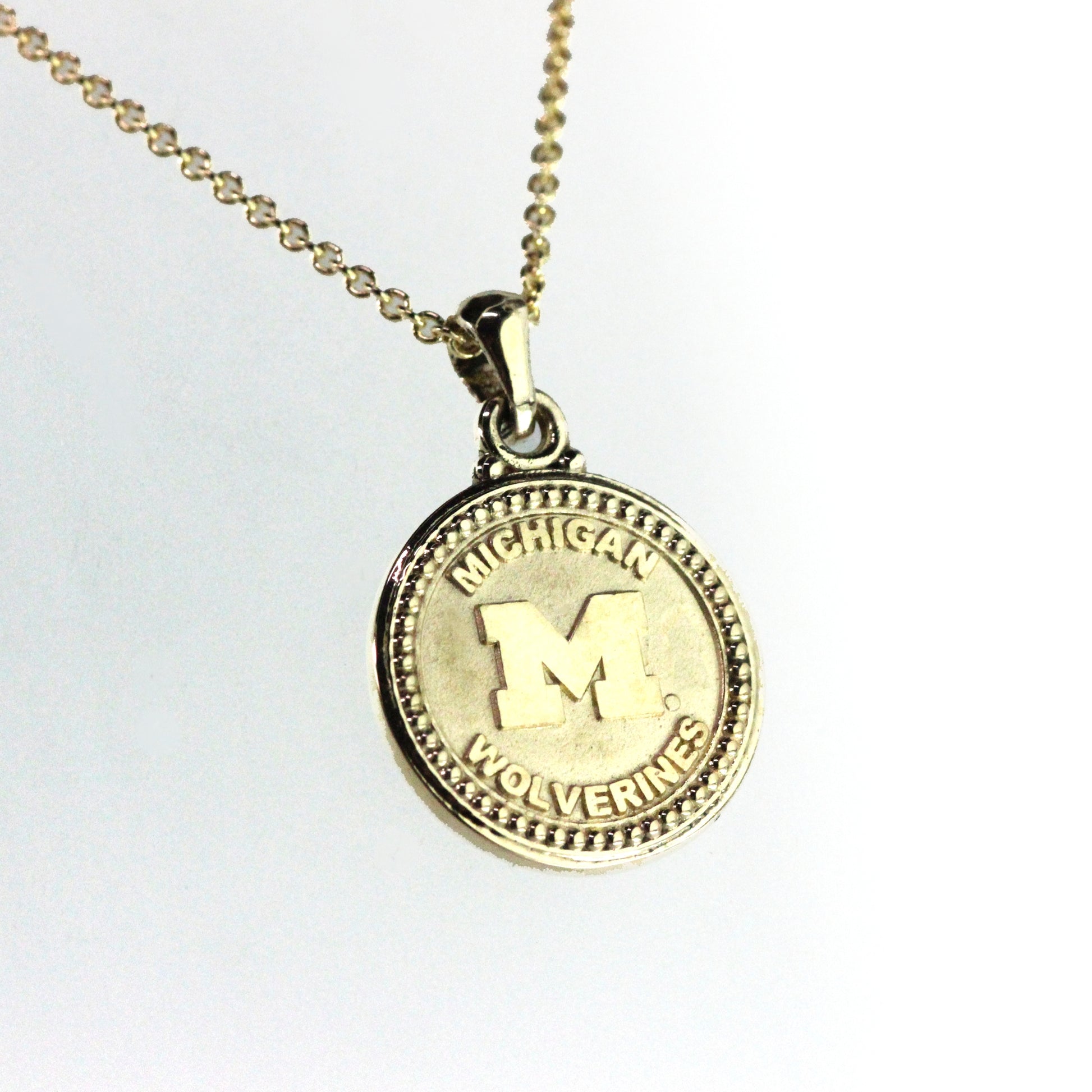 This beautiful Michigan pendant is about the size of a dime. It is 2 sided with the Michigan logo on the front and the NCAA Men's Basketball Champions on the back. It comes on a 14k yellow gold 18" cable chain.